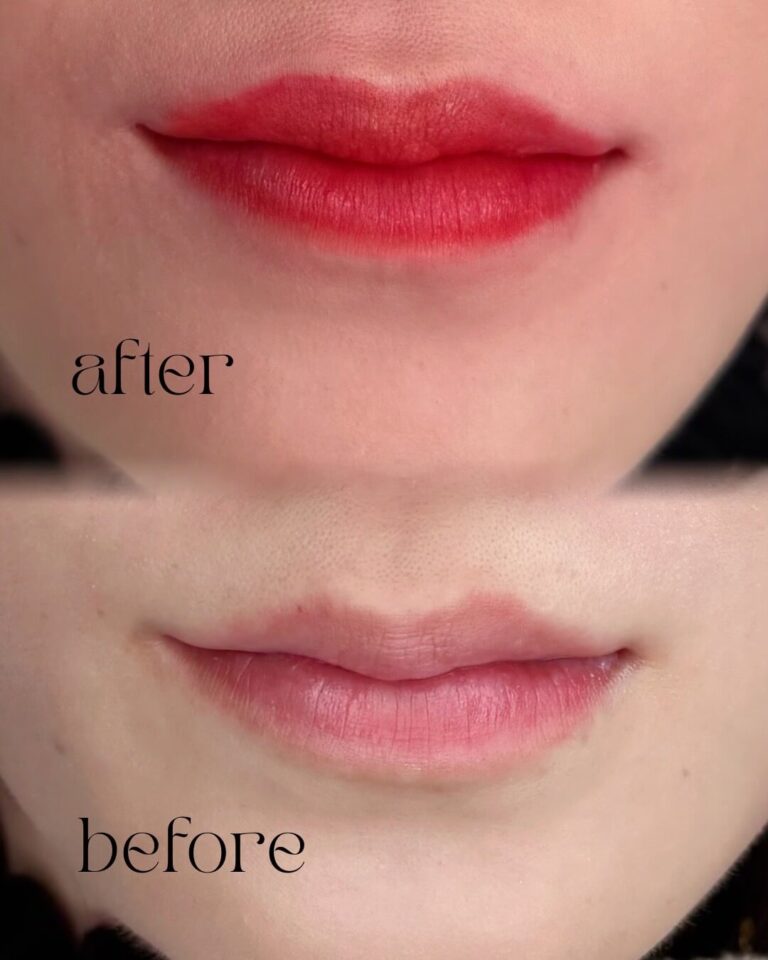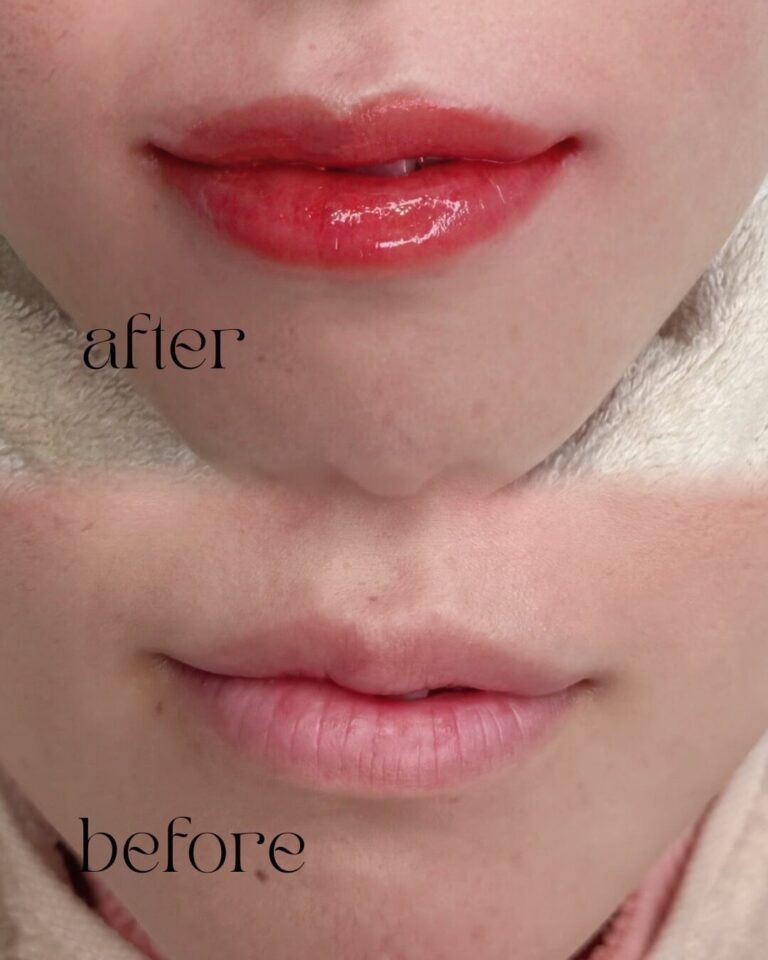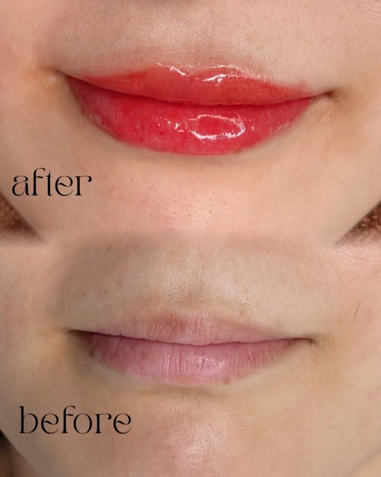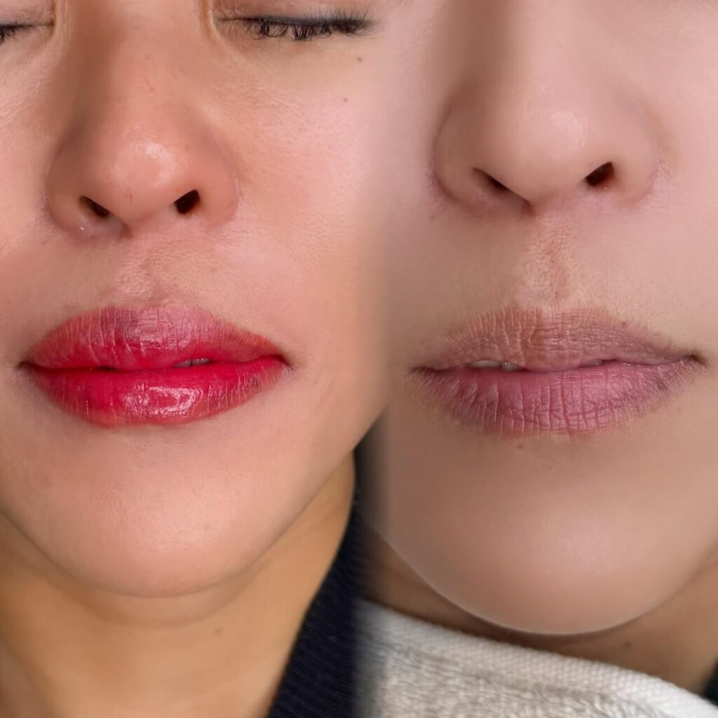 A. ダウンタイムは約1週間です。施術後は赤み・腫れ・ヒリつきが出る場合がありますが、通常は数日で落ち着きます。唇への摩擦や刺激の強い食べ物・飲み物は控えていただくようお願いします。
